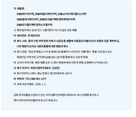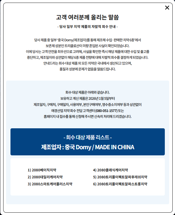 국내 치약 시장을 대표하는 브랜드 중 하나인 애경산업의 2080 치약 일부 제품에서 구강용품에 사용이 엄격히 금지된 보존제 성분이 검출되어 유통가에 큰 파장이 일고 있습니다. 애경산업은 2026년 1월 초, 자사 브랜드 2080의 특정 치약 제품군에서 트리클로산 성분이 혼입된 사실을 인지하고 즉각적인 자발적 회수 조치를 단행했습니다.