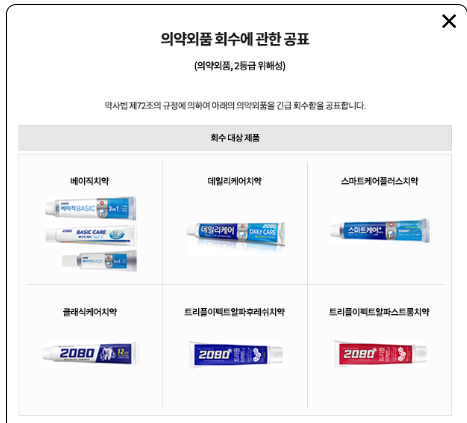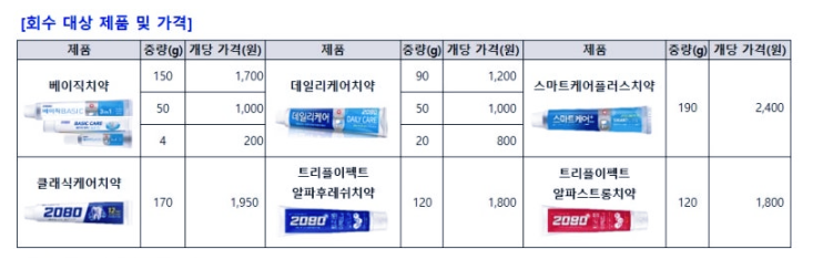 애경산업 측은 식품의약품안전처에 관련 내용을 보고하고 소비자 안전을 위해 제조 시점과 관계없이 전량 회수하기로 결정했다고 밝혔습니다. 트리클로산은 항균 작용을 하는 물질이지만 내분비계 교란 등의 부작용 우려로 국내 구강용품에는 사용이 금지되어 있습니다.